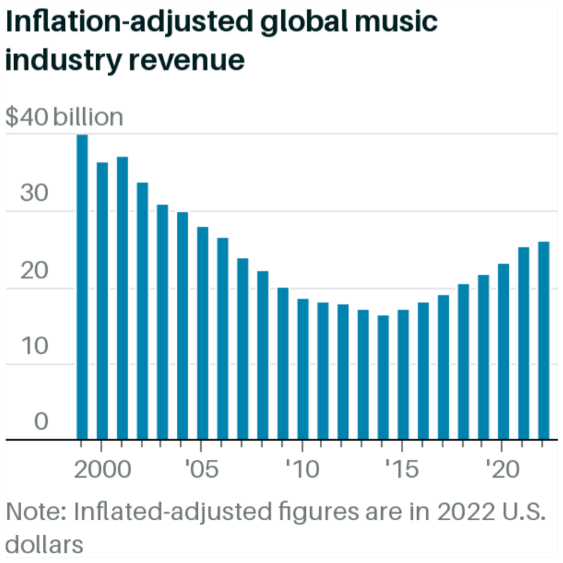 There’s a strong case that the industry can perform much better financially. Culturally, music shows no sign of slowing down. Total global music streams passed one trillion at the end of March, a month faster than last year. Taylor Swift is selling out 50,000-seat arenas every night, at a cost-per-seat that can run into the thousands of dollars. But in comparison with other kinds of media, music’s central role in society isn’t reflected in its financial metrics. Any hardworking drummer or bassist could have told you years ago that they were being shortchanged. Today’s mispricing goes beyond the artists. The recorded-music industry pulled in $26.2 billion last year, less than two-thirds its 1999 revenue in inflation-adjusted terms, even as music has become more accessible than ever.