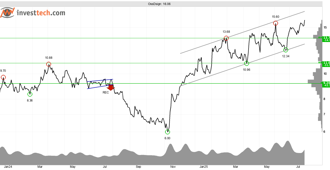 OssDsign är positiv på insiderhandel och tekniskt positiv på medellång sikt (1-6 månader). Resultatrapport för Q2-25 förväntas den 19 augusti. Beroende på utfallet av denna kan den tekniska bilden snabbt komma förändras. I detta fall är en etablering ovanför 13,70 kronor positivt för de tekniska utsikterna. Brott ned försvagar aktien – särskilt kortsiktigt. Det finns flera stöd identifierade ned mot 11 kronor, brott genom denna nivå ger säljsignal på medellång sikt.