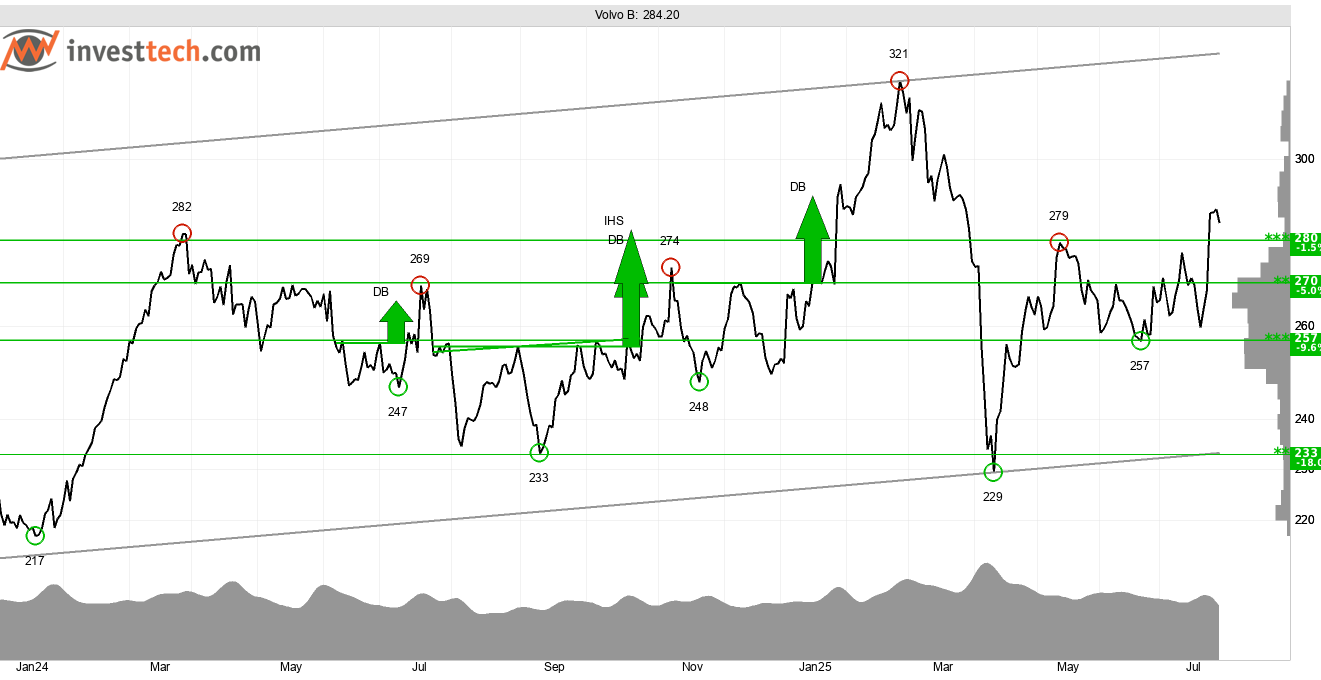 Volvo lade fram resultatet för Q2-25 den 17 juli. Aktien uppvisar efter en stark utveckling senaste veckan en serie positiva tekniska signaler. Brott upp genom motståndet vid 280 kronor har gett köpsignal, och med nästa motstånd vid 320 kronor är uppsidan närmare 12 procent från dagens kurs. Aktien stärks vidare av en stark volymbalans. Vidare uppgång signaleras. 270–280 kronor är närmaste stödnivåer vid reaktion ned.