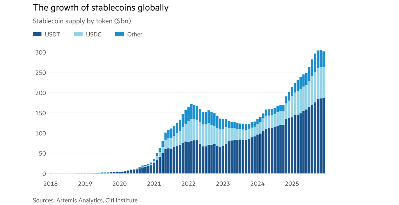 The Libra project was shut down but in the years since, stablecoins have taken on a might of their own; globally, about $310bn worth are now circulating, according to Artemis Analytics, backed by a pot of mostly safe assets such as US Treasuries.