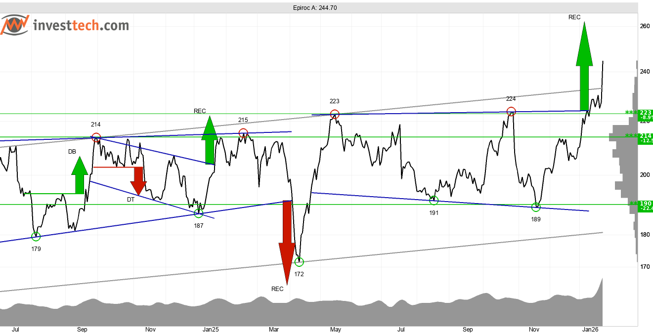 I mitten av januari identifierades även en köpsignal från en rektangelformation (REC) som signalerar en fortsatt uppgång. Det kortsiktiga momentumet i aktien är starkt positiv och motstånd saknas då aktien handlas till all time high. Vid eventuella reaktioner ned återfinns stöd vid 223 kronor.