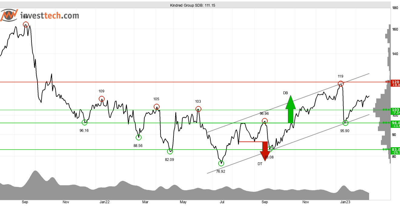 Kindred Group med verksamhet inom spelbranschen presenterade resultatet för 2022 den 8 februari, och uppvisar i kölvattnet av denna goda tekniska utsikter på medellång sikt. Bolagets aktie utvecklas i en stigande trend vilket är resultatet av att investerare över tid köpt in sig till allt högre kurs. Brott genom motståndet vid 103 kronor har gett köpsignal, och vi har på uppsidan närmast att förhålla oss till motståndet vid 120 kronor. Brott genom denna nivå ger ny köpsignal. 103 kronor är stöd vid reaktion ned.