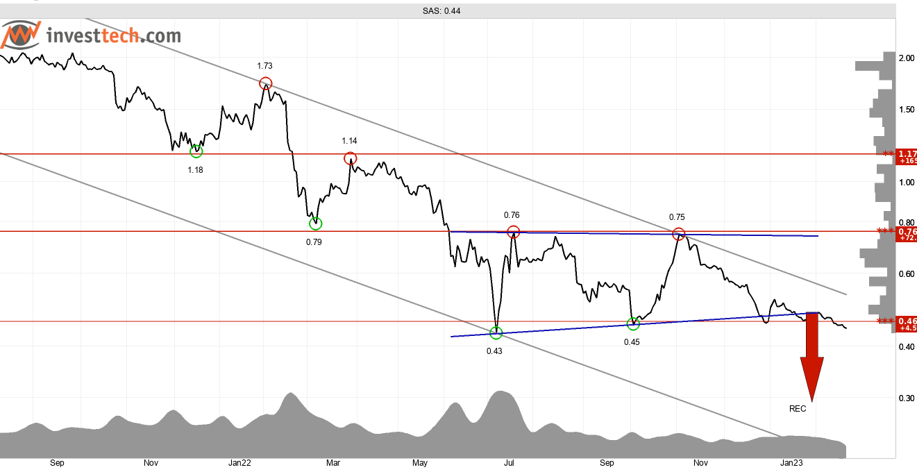 Flygbolaget SAS har en lång period av negativ utveckling bakom sig. Bolaget förväntas presentera resultatet för Q1-2023 under torsdagen (24/2), och uppvisar inför denna idel negativa tekniska signaler. Aktien utvecklas i en brant fallande trend på medellång sikt och har fått säljsignal efter brott ned genom nivåerna runt 0,46-0,50 kronor. Aktien har även fått säljsignal från kursformation (rektangel, REC). Stöd under dagens kurs saknas vilket öppnar för potentiellt stor nedsida.