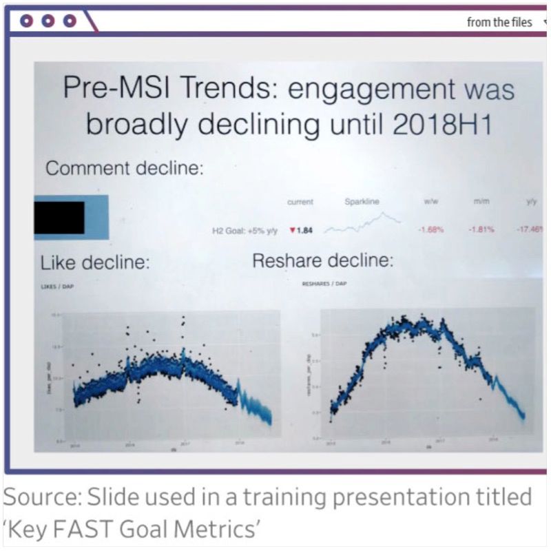 From a business perspective, it worked. As Facebook predicted, time spent on the platform declined, but the effort to maximize interactions between users slowed the free fall in comments, and mostly improved the all-important metric of “daily active people” using Facebook, according to tests run in August 2018, internal memos show.