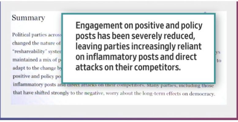 Company researchers discovered that publishers and political parties were reorienting their posts toward outrage and sensationalism. That tactic produced high levels of comments and reactions that translated into success on Facebook.