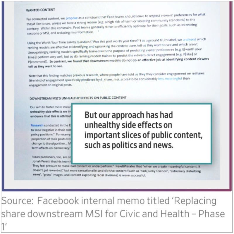 “Our approach has had unhealthy side effects on important slices of public content, such as politics and news,” wrote a team of data scientists, flagging Mr. Peretti’s complaints, in a memo reviewed by the Journal. “This is an increasing liability,” one of them wrote in a later memo.