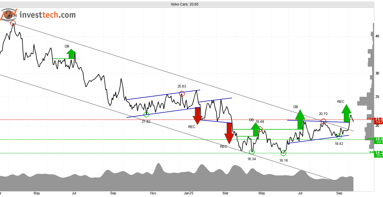 Volvo Cars ser ut att stå inför en vändning efter en lång period av negativ utveckling. Aktien bottnade runt 16,20 kronor under första halvåret 2025, och har därefter noterat allt högre bottnar. Den ökande optimismen bland investerarna återspeglas i en stigande trend i grafen på kort sikt. Aktien har också fått köpsignal från rektangelformation vilken indikerar uppgång mot 24 kronor. Signalvärdet stärks av en starkt positiv volymbalans och ett starkt momentum, indikerande aggressiva köpare och passiva säljare. Motståndet vid 21 kronor testas – brott genom detta ger ny köpsignal. Stöd finns vid 18,40 kronor.