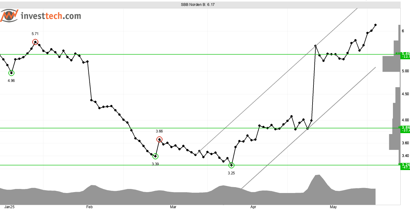 Fastighetsbolaget SBB:s B-aktie har bjudit på stora kursrörelser sedan årsskiftet. Aktien bottnade intill 3,25 kronor i april och har därefter utvecklats starkt. Aktien steg 40 procent på resultatrapporten den 13 maj och har därefter fått köpsignal efter brott upp genom motståndet vid 5,40 kronor. Motstånd vid 8,10 kronor ger en uppsida på drygt 31 procent i dagsläget. Den underliggande tekniska bilden är god med en starkt stigande trend, en stark volymbalans, och ett starkt momentum signalerat av ett 21-dagars RSI på 74.