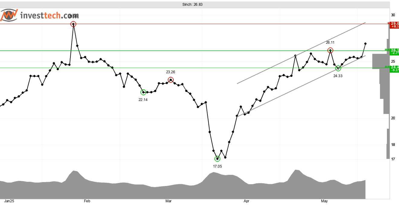 Aktien till teknikbolaget Sinch har stärkts kortsiktigt efter att motståndet vid 26,10 kronor brutits. Brottet har föregåtts av en stark utveckling sedan botten i början av april. En starkt stigande trend är identifierad i grafen på kort sikt ovan. Trendbilden bekräftas av en starkt positiv volymbalans indikerande aggressiva köpare och passiva säljare. På kort sikt gynnas aktien vidare av ett positivt momentum. 29 kronor är motstånd och 26,10 kronor numer stöd.