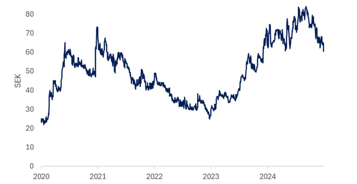 Sätter vi en EV/S-multipel om 4-5x för 2026e, i linje med peers, motsvarar det ett aktievärde på 79–97 kronor. Vi vill samtidigt betona att vi, baserat på våra estimat och FactSet-konsensus, förväntar oss att Paxman växer avsevärt snabbare än medianen i peer-gruppen de kommande åren. Då vi anser att försäljningstillväxten är den faktor som starkast förklarar vilken multipel dessa bolag handlas till, menar vi att Paxman, om de levererar på förväntningarna, bör kunna handlas till en premie.