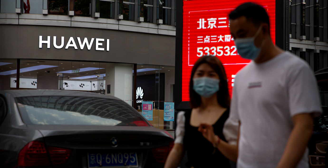Två personer utanför en Huawei-butik i Kina. (Mark Schiefelbein / TT NYHETSBYRÅN)