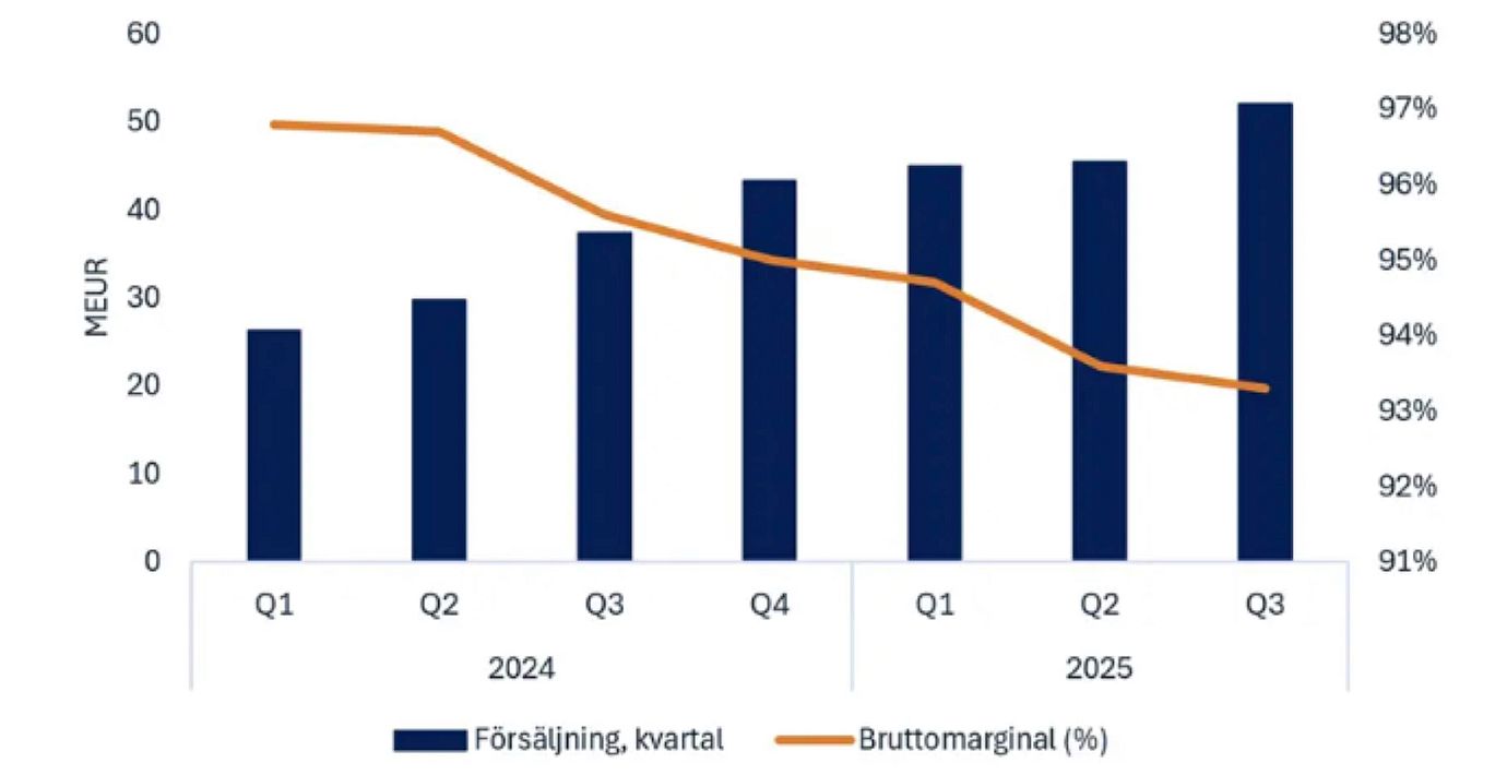 Den större förändringen av tredjepartsutvecklade spel (OpenRGS) kan tolkas som att man numera kan se ett skifte i intäktsmixen som på sikt kommer dämpa den optiska bruttomarginalen och således EBIT-marginalen, även om verksamhetens underliggande lönsamhet förblir intakt. Denna marginalkontraktion bör dock inte tolkas som en lönsamhetsförsämring, utan snarare som en optisk effekt av redovisningsstandard enligt IFRS. När andelen intäkter från OpenRGS växer så kommer kostnaden för sålda varor (COGS) oproportionerligt öka då tredjepartnerstudios andel måste kostnadsföras här. För OpenRGS-delen utgör bruttovinsten därför det mest representativa måttet för verksamhetens underliggande lönsamhet.