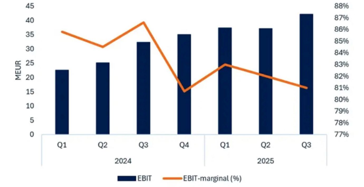 Givet fortsatt momentum i tillväxten kommande år samt en stark kassaflödeskonvertering (ca 90% till operationellt kassaflöde) med låga investeringsbehov och låg rörelsekapitalbindning (pga en kapitallätt affärsmodell) bedömer vi utdelningskapaciteten som uthållig även på längre sikt. Med en effektiv skattesats om ca 6% och obefintliga finansiella kostnader (inga räntebärande skulder) bör bolaget kunna återföra EUR 148m till aktieägarna 2026, vilket motsvarar bolagets mål om att återföra 75% av nettovinsten. Utifrån dessa antaganden kan investerare tillgodoräkna sig en yield på ca 8,4% på dagens kursnivåer. Vi anser att bolaget i dagsläget står inför en attraktiv asymmetri i risk/reward där bolaget även handlas på attraktiva multiplar (8,9x EV/EBIT) 2026e.