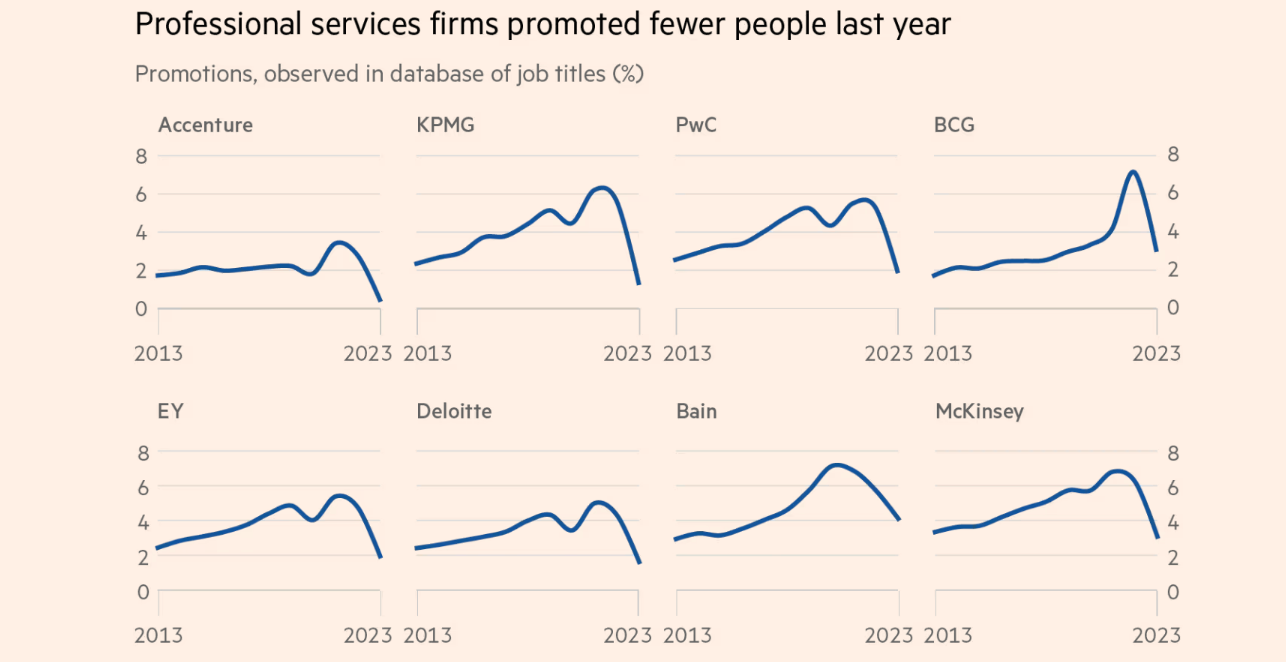 Live Data Technologies, which tracks the job titles of millions of white-collar workers, observed many fewer promotions in 2023 than in the previous year at consulting and accounting firms. At Bain and BCG, the proportion of staff spotted making upward moves was back down to pre-pandemic levels; at McKinsey it was below anything seen in at least 10 years.