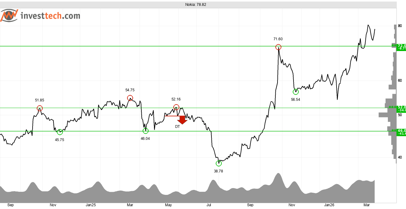 Nokia-aktien har klättrat stadigt från bottennoteringen i månadsskiftet juli/augusti, och handlas i dag på nivåer vi inte sett sedan 2010. Den ökande optimismen bland investerarna återspeglas i en brant stigande trend i grafen på kort sikt, en stark volymbalans, och ett positivt momentum. Brott upp genom 72 kronor har gett köpsignal. Avsaknaden av motstånd öppnar för fin utveckling framöver. 72 kronor är stöd vid reaktion ned. Den underliggande tekniska bilden är också positiv med köpsignal från gyllene kors i november, då 50-dagars glidande medelvärde korsade 200-dagars glidande medelvärde.