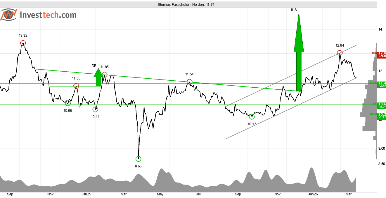 Stenhus Fastigheter är ett tekniskt intressant case. Köpsignal från omvänd huvud-skuldra-formation utlöstes i december, vilket också sammanföll med köpsignal från gyllene kors där 50-dagars glidande medelvärde korsade 200-dagars glidande medelvärde. Den underliggande tekniska bilden är god med en brant stigande trend identifierad i kursdiagrammet på medellång sikt. Aktien stärks vidare av en kurs ovanför 11,46 kronor vilken är stödnivå.