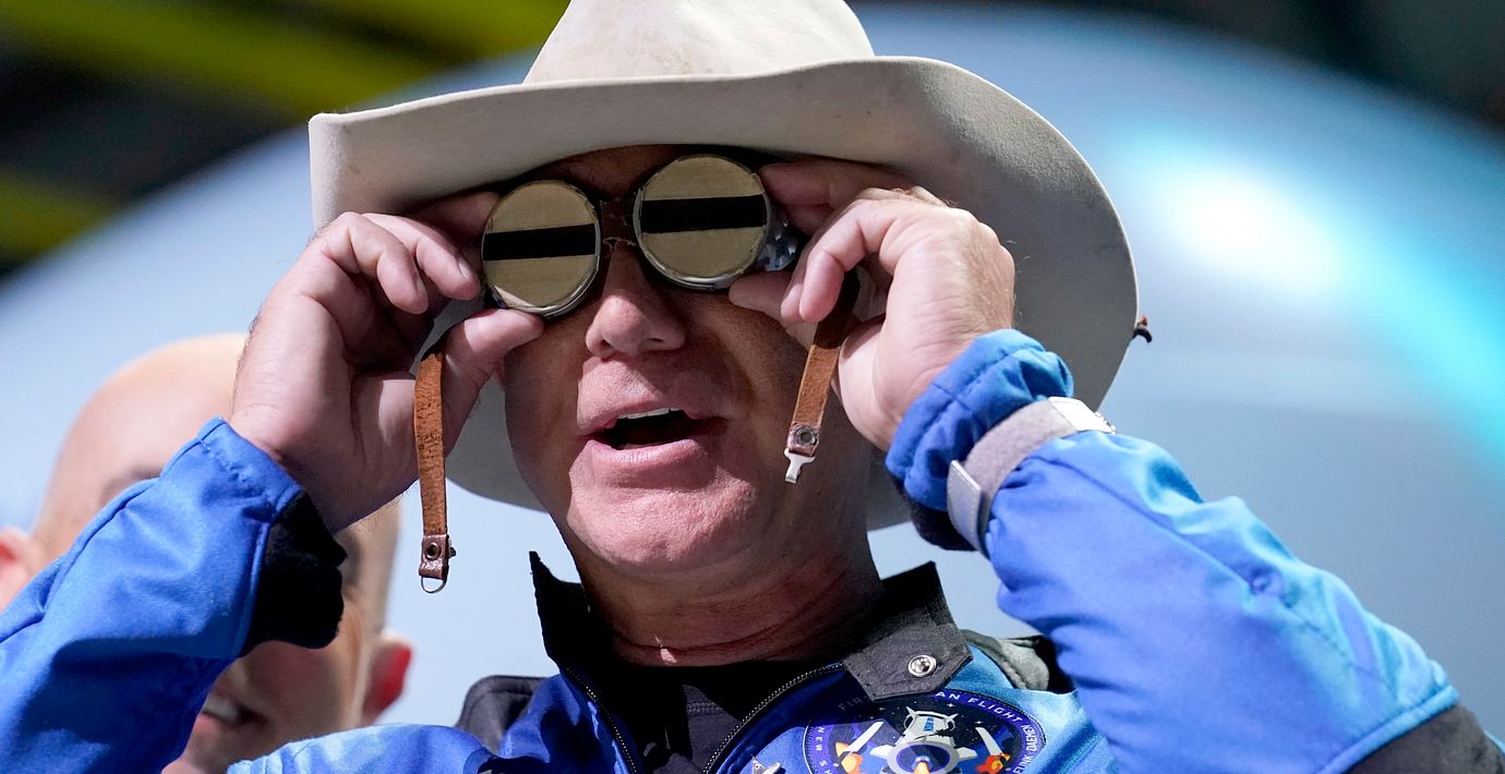 Jeff Bezos, här iförd ikoniska flygaren Amelia Earharts glasögon, har affärsintressen med amerikanska myndigheter. (Tony Gutierrez / AP)