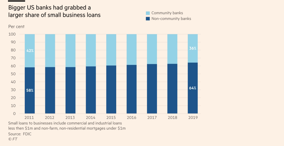Lokala banker i USA, så kallade community banks, spelade en avgörande roll under pandemin. De hanterar en bråkdel, 15 procent, av lånen i banksystemet, men administrerade 60 procent av lönegarantiprogrammet som skulle rädda småföretag under pandemin. De känner sina kunder, har högre kapitaltäckning och tar mindre risk, skriver Financial Times.