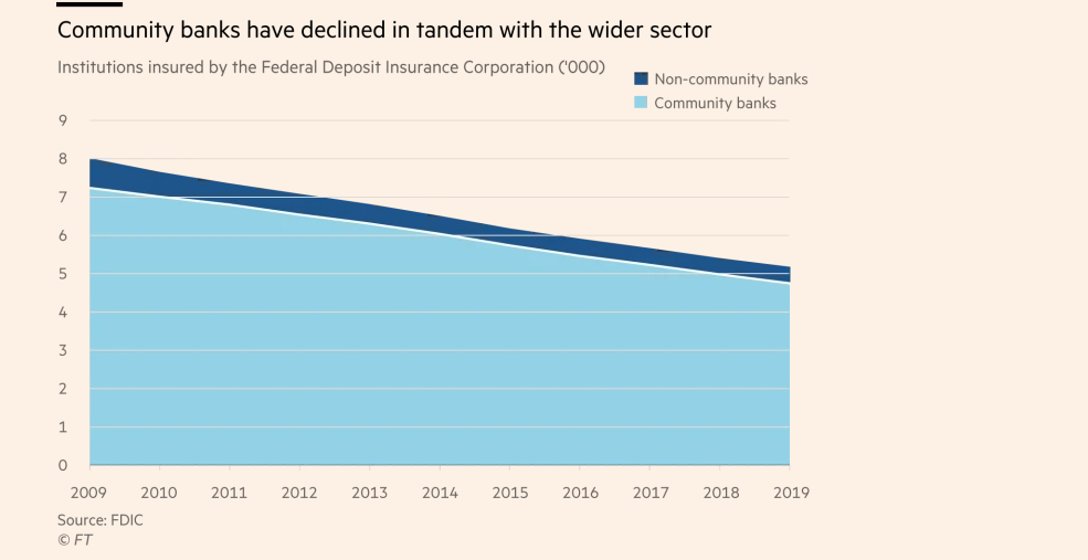 State and federal laws discouraged or prevented commercial banks from opening multiple branches or moving across state lines. Those laws began to be lifted from the 1980s, leading to waves of mergers. In 1990 there were 13,568 community banks, according to the Federal Deposit Insurance Corporation. By the first quarter of 2020, there were only 4,624. But the industry remains far less concentrated in America than in the rest of the developed world. The sector is also significantly less balanced than it used to be. In the early 1980s, community banks held 38 per cent of US banking assets. For the past several years, that has hovered around 12 per cent.