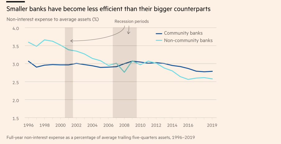 Smaller banks still tend to have lower overall returns, because they don’t trade assets or tend to offer wealth management services. And FDIC data show that community banks require more staff. They hold $7m in assets for every employee. Larger banks hold $12m, a gap that has been growing since the financial crisis.