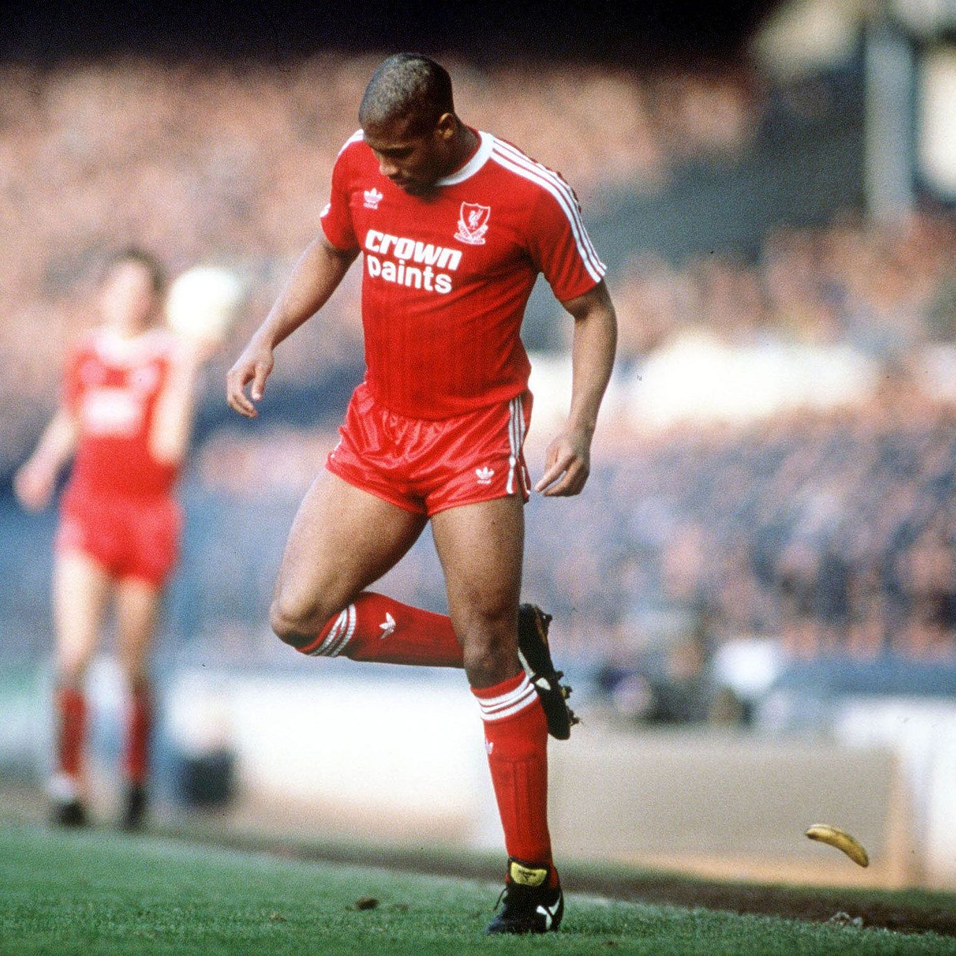 In a soccer game in Liverpool’s Goodison Park in 1988, player John Barnes stepped away from his position and used the back of his heel to kick away a banana that had been thrown toward him. Captured in an iconic photo, the moment encapsulated the racial abuse that Black soccer players then faced in the U.K.