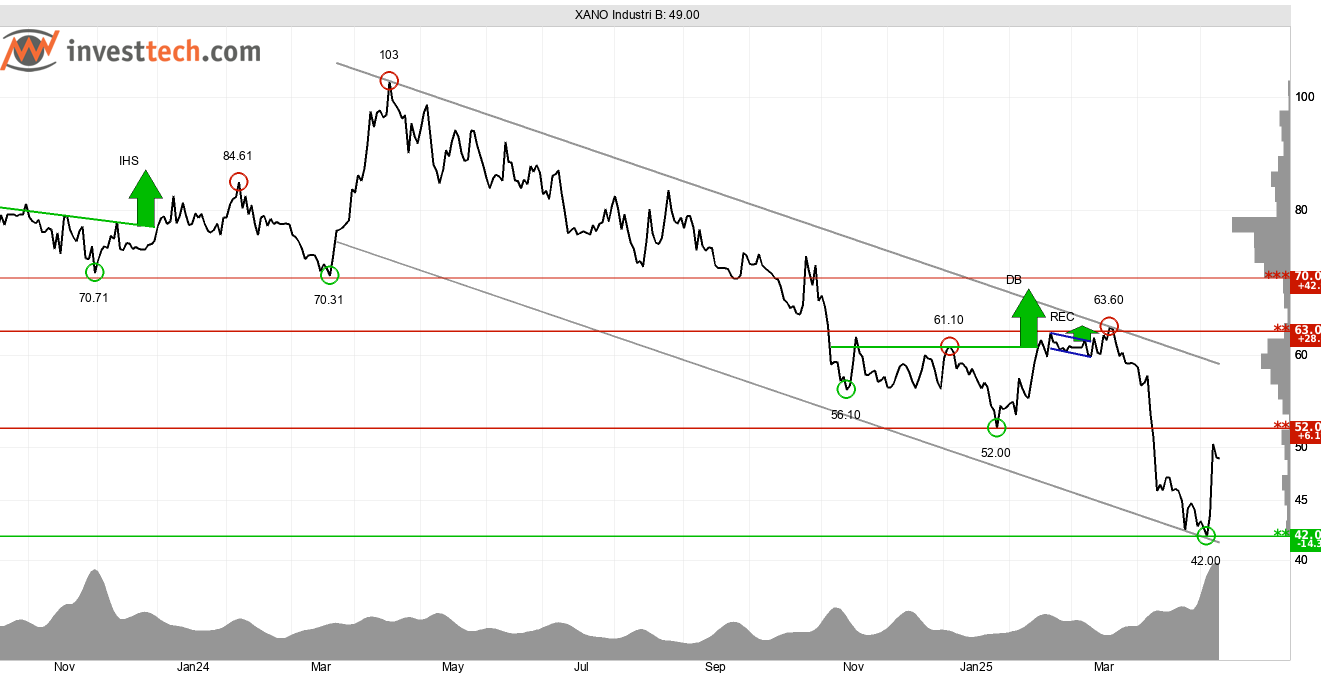Xano som bedriver utveckling och tillverkning av mjukvara för industriell automation och datainsamling ser tekniskt negativ ut. Aktiekursen har fallit till lägre och lägre nivåer under det senaste året och Investtechs algoritmer har därmed identifierat flera säljsignaler. Trendbilden är tydlig. Det har identifierats negativa trendkanaler på både kort, medellång och lång sikt.