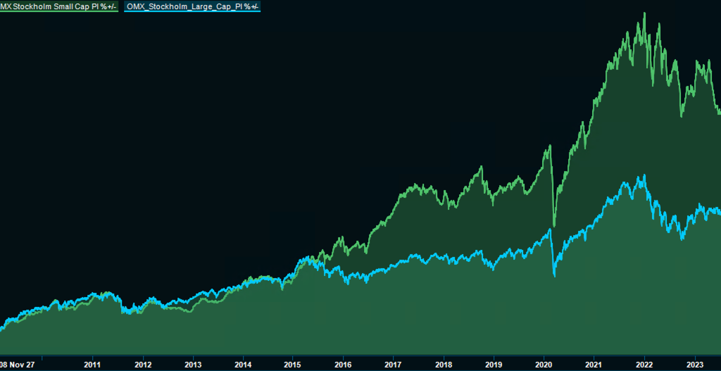 Stockholmsbörsen small cap- och large cap-index 2009–2023. Small cap, den gröna linjen, har slått large cap rejält över tid. (Infront.)