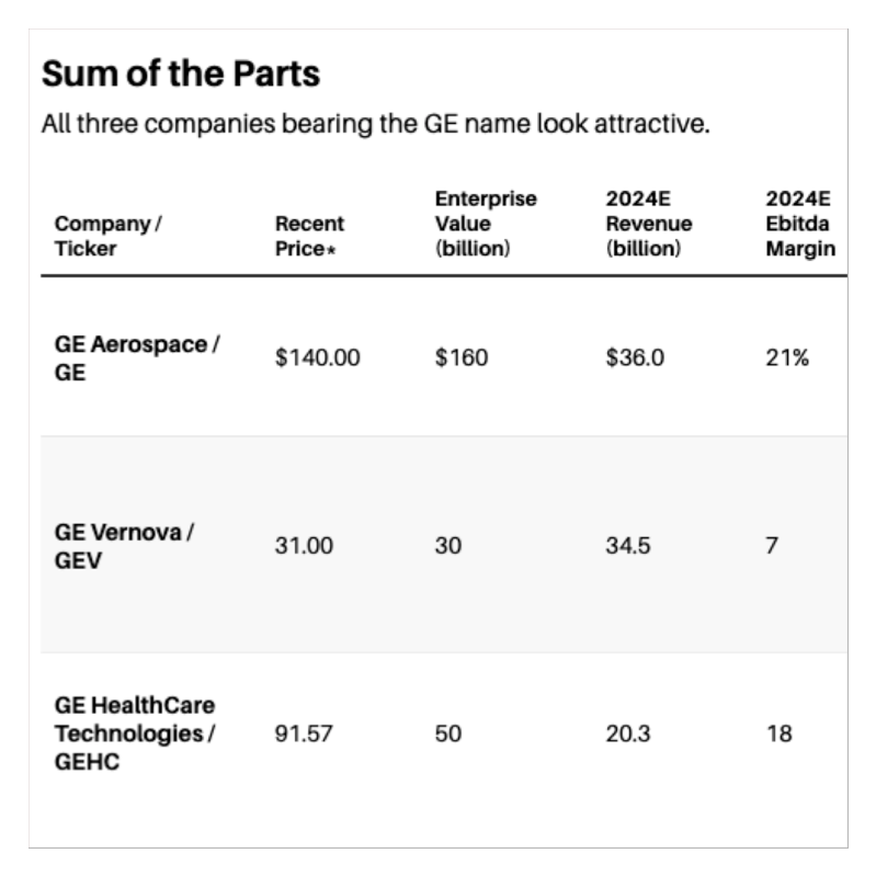 Aerospace is so strong that it accounts for most of General Electric’s current value. While it could be compared with RTX , which makes jet engines, flight controls, and a host of defense products, and trades for 12 times Ebitda, or Safran , a GE partner on the single-aisle jet engines, which trades for about 16 times, a better multiple might be that of aftermarket parts supplier TransDigm Group , which changes hands at 18 times. Herbert argues that’s the valuation GE Aerospace deserves, which implies a value of about $160 billion based on Ebitda estimates for the coming two years, or about $140 of current General Electric’s share price.