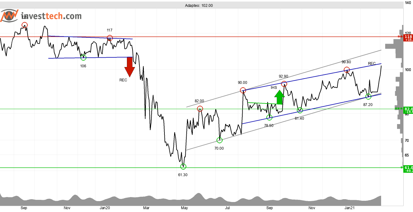 Adapteo som är verksamma inom fastighetsbranschen ser tekniskt spännande ut. Aktiekursen befinner sig i en stigande trendkanal som Investtechs trendalgoritm har identifierat på kursdiagrammet för medellång sikt. Det är ett resultat av att marknaden har varit villiga till att betala allt högre kurser för att köpa aktier i bolaget.