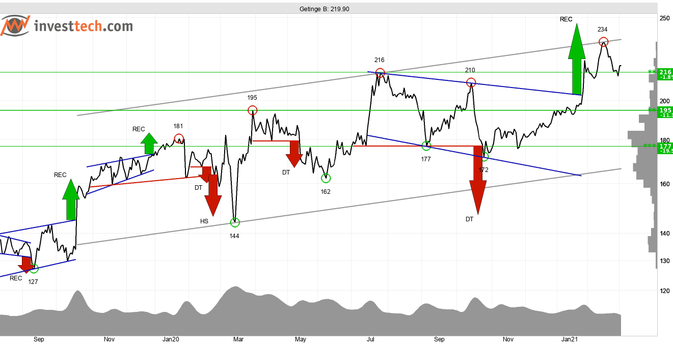 Getinge som producerar och levererar tekniska lösningar för sjukvårdsindustrin ser tekniskt positiv ut. Trendmessigt återfinns kursen i en stigande trendkanal som Investtechs trendalgoritm har identifierat på kursdiagrammet för medellång sikt.