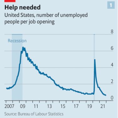 The current jobs market looks extra ordinary by historical standards. December saw 10.9m job openings, up by more than 60% from December 2019. Just six workers were available for every ten open jobs. Predictably, many seem comfortable abandoning old positions to seek better ones. This is evident among those who clean bedsheets and stock shelves, as well as those building spreadsheets and selling stocks. In November 4.5m workers quit their jobs, a record. Even if rising wages and an ebbing pandemic lure some of them back to work, the fight for staff may endure.