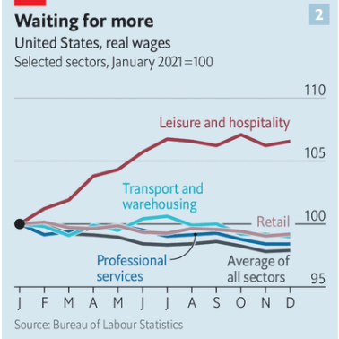 But base pay is rising, too. Bank of America says it will raise its minimum wage to $25 by 2025. In September Walmart, America’s largest private employer, set its minimum wage at $12 an hour, below many states’ requirement of $13-14 but well above the federal minimum wage of $7.25. Amazon has lifted average wages in its warehouses to $18. The average hourly wage for production and nonsupervisory employees in December was 5.8% above the level a year earlier; compared with a 4.7% jump for all private-sector workers. Firms face pressure to lift them higher still. High inflation ensured that only workers in leisure and hospitality saw a real increase in hourly pay last year.