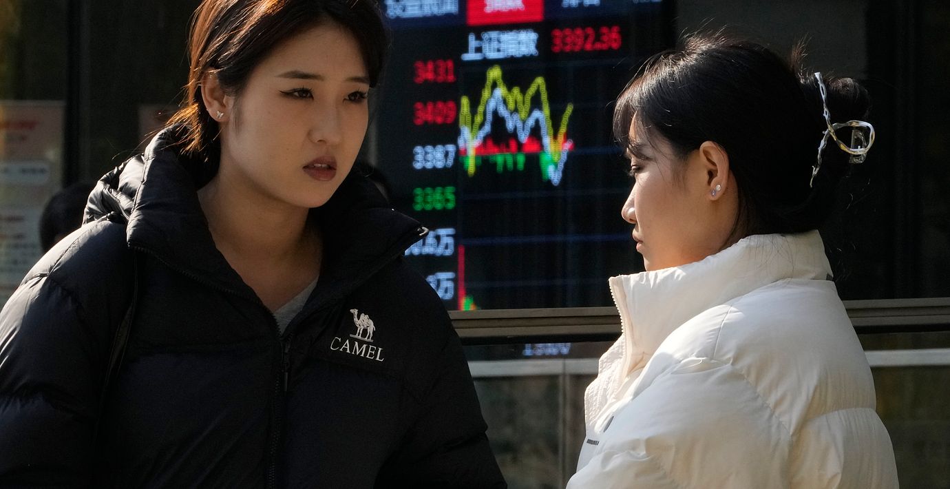 Kvinnor framför skylt med börskurser i Beijing. (Ng Han Guan / AP)