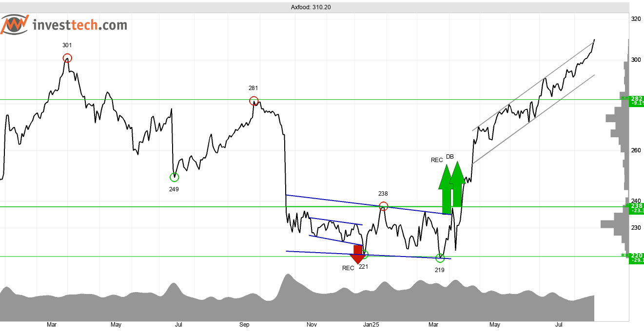 Axfood, som är verksamt inom dagligvaruhandeln med fokus på detaljhandel, grossisthandel samt livsmedelsdistribution, ser tekniskt positiv ut. Kursen har under de senaste dagarna brutit upp genom taket i den stigande trendkanalen som Investtechs algoritmer har identifierat på kursdiagrammet för medellång sikt. Det indikerar optimism bland investerare och att vi kan förvänta oss en ännu starkare stigningstakt jämfört med tidigare.