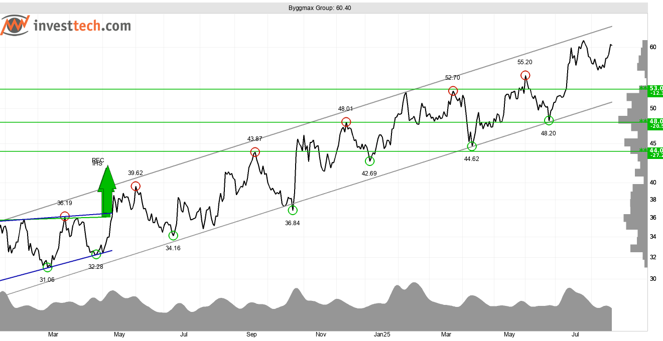Byggmax Group, som är verksamt inom försäljning av byggmaterial och trädgårdsprodukter, utvecklas inom en stigande trendkanal som Investtechs algoritmer har identifierat på kursdiagrammet för medellång sikt. Den positiva kursutvecklingen är ett resultat av att investerare har valt att betala mer och mer för att köpa in sig i bolaget och det signalerar en ökande optimism.