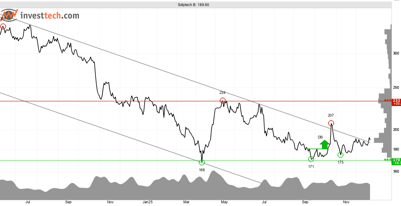 På senare tid har aktiekursen till Sdiptech B brutit upp genom taket på den fallande trendkanalen som Investtechs algoritmer har identifierat på kursdiagrammet för medellång sikt. Ser vi till kort sikt så har det även identifierats en stigande trendkanal. Närmaste motståndsnivå återfinns runt 207-233 kronor vilket gör att uppsidan anses bra. Stöd återfinns runt 170 kronor. Om aktiekursen bryter ned genom taket i trendkanalen och eller bryter ned genom stödnivån så försvagas de tekniska utsikterna markant.