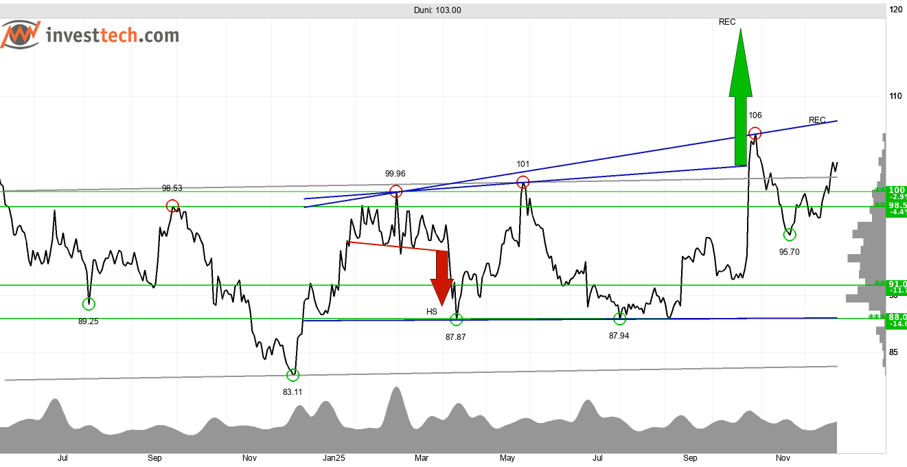 I oktober i år identifierades även en köpsignal från en rektangelformation (REC) som signalerar en fortsatt uppgång. Även en ny REC-formation är under utveckling och ett etablerat genombrott på antingen runt 88,04 kronor eller 107 kronor kommer att signalera fortsatt utveckling i samma riktning. Det saknas motstånd i kursdiagrammet och vid reaktioner tillbaka återfinns stöd vid cirka 100 kronor.
