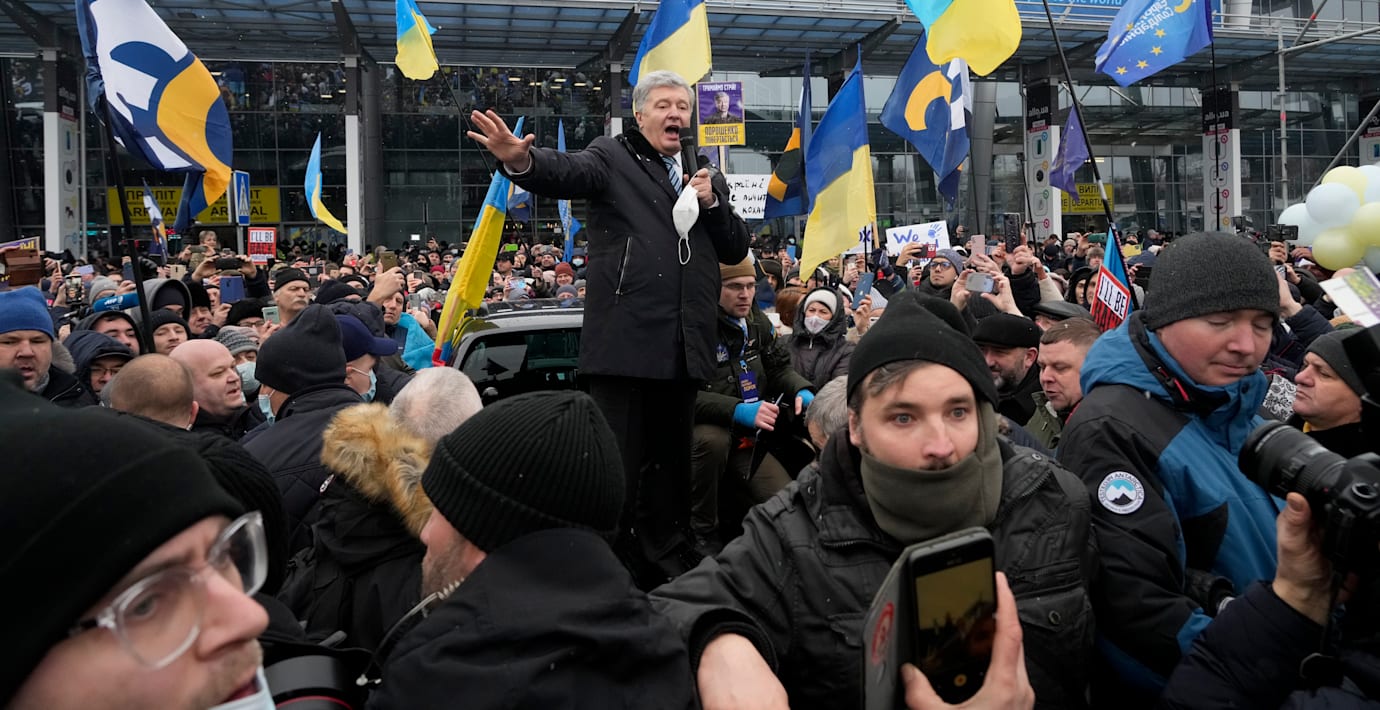 Tusentals anhängare mötte Ukrainas ex-president Petro Porosjenko när han landade på flygplatsen i Kiev på måndagen.