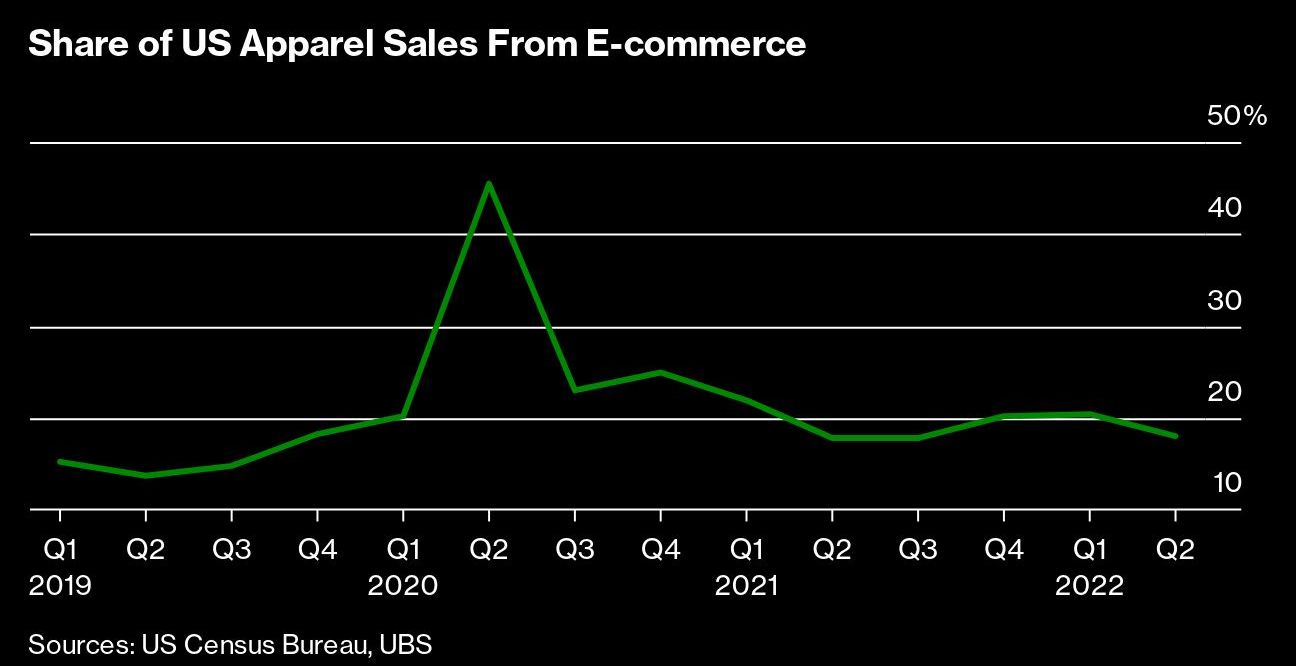 Turns out they have. In the US, the e-commerce wave has receded. In some categories, such as clothing, the percentage of sales made online is back to where it was before the pandemic, according to an analysis by UBS. For the past five quarters, online growth has trailed the sales gains of the overall retail industry, according to US Census Bureau data.