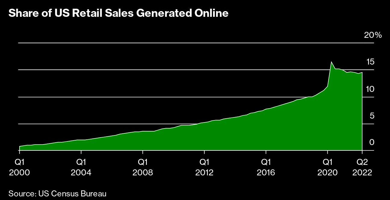 It’s tempting to blame the economy for the e-commerce slowdown. Inflation is running at the highest level in four decades, leading the Federal Reserve to sharply raise interest rates and many economists to predict the US will slip into recession. But the latest data show consumer spending overall hasn’t collapsed: Excluding gasoline, retail sales rose a healthy 0.8% in August.