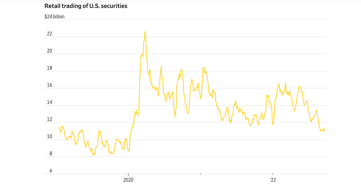 Retail, or nonprofessional, investors have been enthusiastic dip buyers, piling in even when institutional investors are coming out. That buying fervor has been an important counterweight for the market—and if it wavers, stocks could suffer even more.