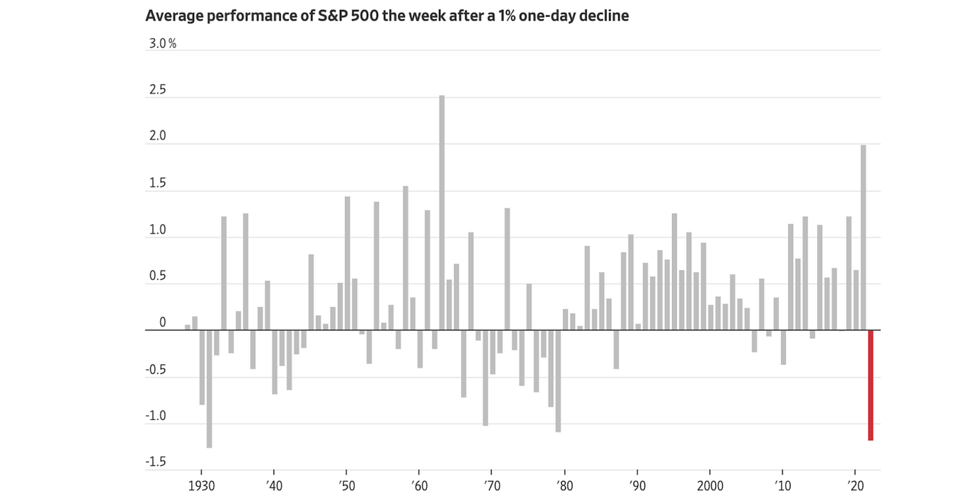 Instead of rebounding after a tumble, stocks have continued to fall, burning investors who stepped in to buy shares on sale. The S&P 500 has dropped 1.2% on average this year in the week after a one-day loss of at least 1%, according to Dow Jones Market Data. That is the biggest such decline since 1931.