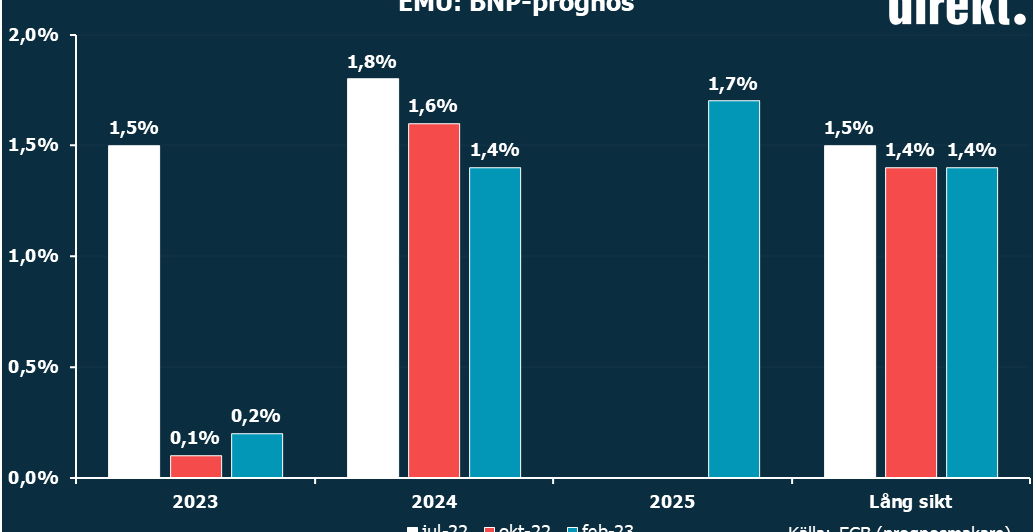Tillväxtprognosen revideras upp något för i år, till +0,2 procent, medan prognosen för 2024 revideras ned 0,2 procentenheter, till +1,4. Arbetslöshetsprognosen revideras ned något.