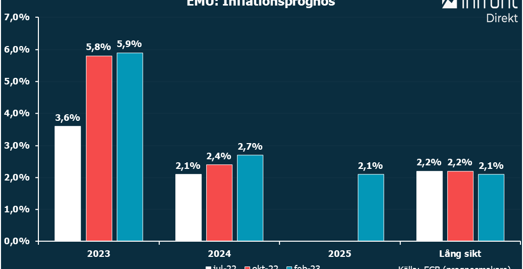 HIKP-inflationen väntas bli 5,9 procent i år, 2,7 procent nästa år och 2,1 procent år 2025. I förra prognosen spåddes 5,8 procent i år och 2,4 procent nästa år.