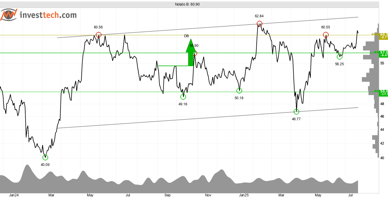 Nolato är ett svenskt företag som utvecklar och tillverkar produkter och komponenter i polymera material för användning inom medicinteknik, telekommunikation och industriella tillämpningar. Bolagets aktie är noterad på Nasdaq Stockholm, Large Cap-listan. Bolaget lade fram resultatet för andra kvartalet 2025 under fredagen (18/7). Aktien avancerade 4,2 procent på denna, vilket gjorde att motståndet vid 60,50 kronor bröts. Köpsignal är utlöst – om än nätt och jämnt. Vi behöver se en etablering av kursen ovanför 60–63 kronor för stärkt robusthet i signalen. Brott genom dessa nivåer öppnar för fin uppsida mot 79 kronor där nästa motstånd finns i kursdiagrammet på lång sikt.