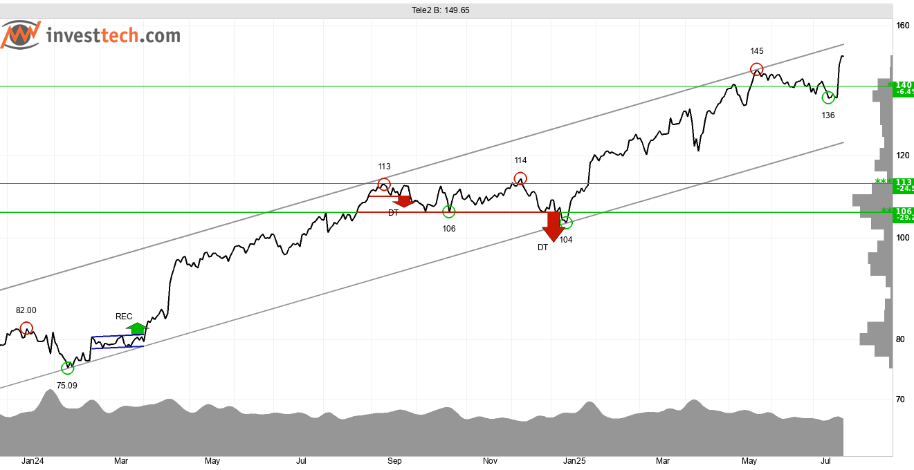 Tele2 har fått köpsignal i kölvattnet av offentliggörandet av resultatet för Q2-25 den 17 juli. Aktien har klättrat 8,8 procent senaste veckan och därmed brutit motstånden vid 140–145 kronor. Motstånd saknas ovanför dagens kurs, 140–145 kronor är stöd. Den underliggande tekniska bilden är stark med en homogen, stigande trend som sträcker sig hela tidsperioden för kursdiagrammet på medellång sikt (18 månader). Trendbilden och köpsignalen stärks av en stark volymbalans, vilket är resultatet av att aktien handlats upp under ökande volym senaste tiden.