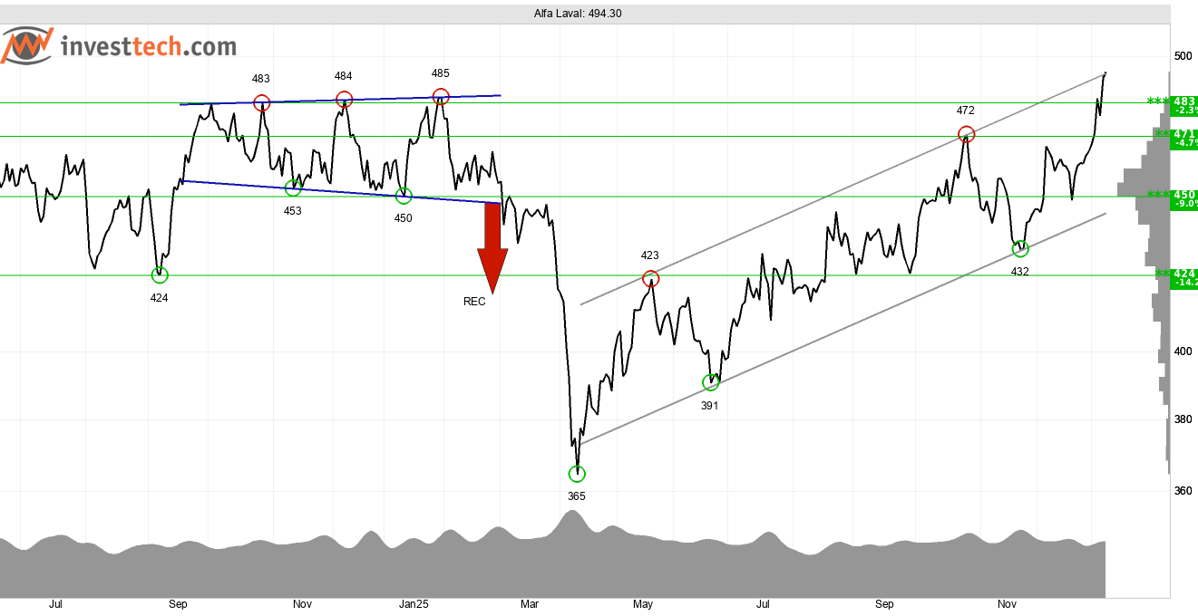 I april 2025 handlades tillverkningsbolaget Alfa Laval till årslägsta, och efter att ha nått en bottennivå runt 365 kronor har investerare valt att betala mer och mer för att köpa in sig i bolaget. Investtechs trendalgoritm har identifierat en stigande trendkanal som signalerar fortsatt optimism bland investerare. Aktiekursen har nu brutit upp genom taket i trendkanalen och det medför att vi kan förvänta oss en snabbare stigningstakt jämfört med tidigare.