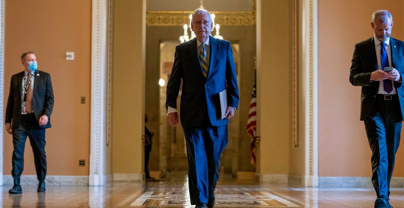 ”För att skydda det amerikanska folket från en stundande Demokrat-skapad kris, kommer vi att tillåta Demokraterna att ta till normala förfaranden för att få igenom en tillfällig höjning av skuldtaket fram till december”, skriver McConnell.
