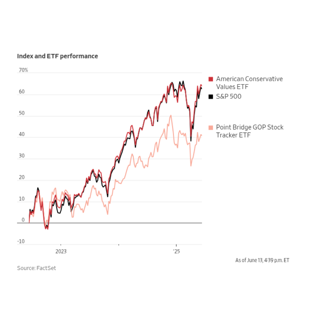 The conservative-values ETF has roughly tracked the S&P 500’s performance over the past three years. The MAGA fund has lagged behind the S&P 500 by more than 20 percentage points.