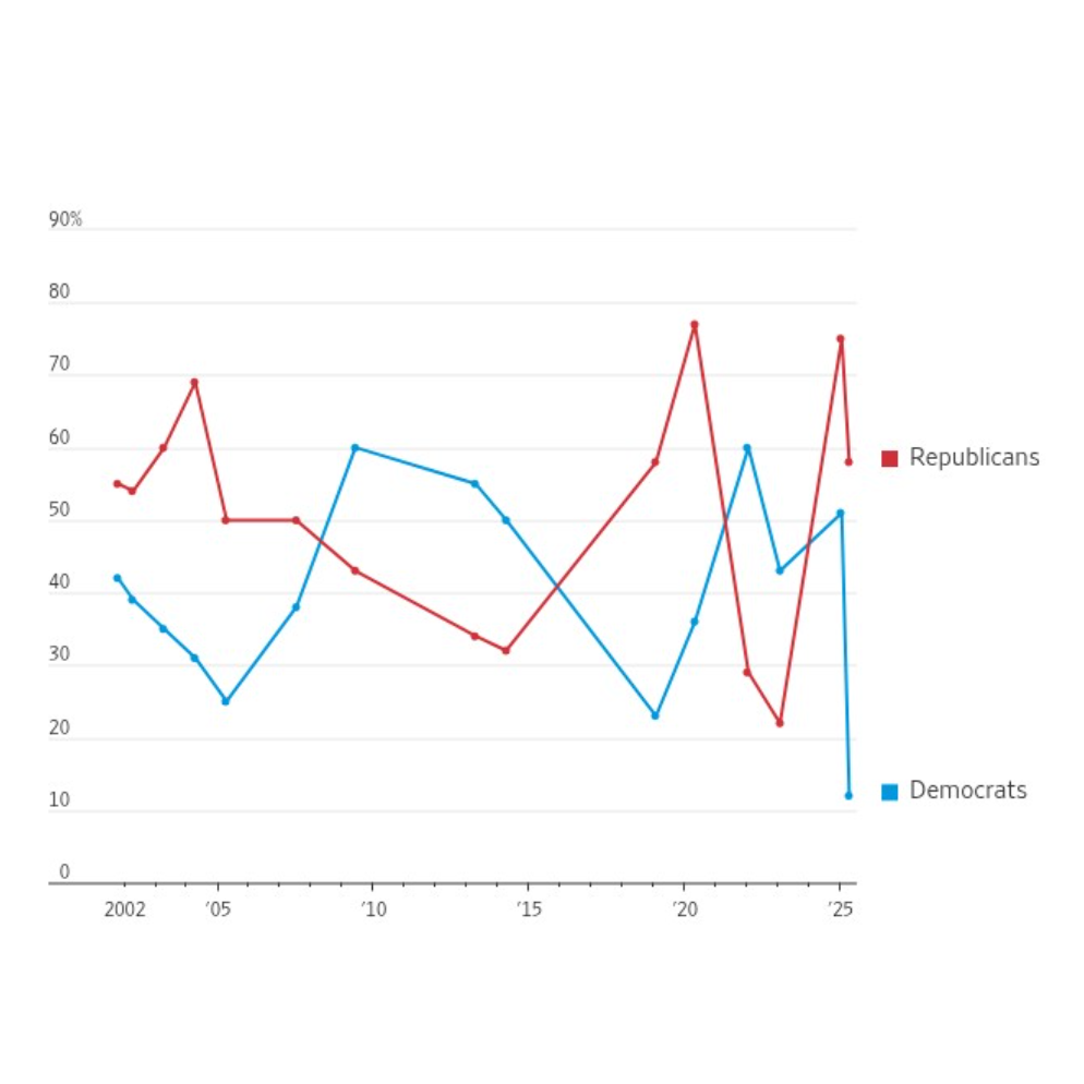 The 47-point gap in partisan optimism regarding the stock market’s trajectory is the largest divide observed in Gallup data provided to The Wall Street Journal going back to 2001. That year, during George W. Bush’s presidency, the optimism gap between Republicans and Democrats stood at 13 percentage points.